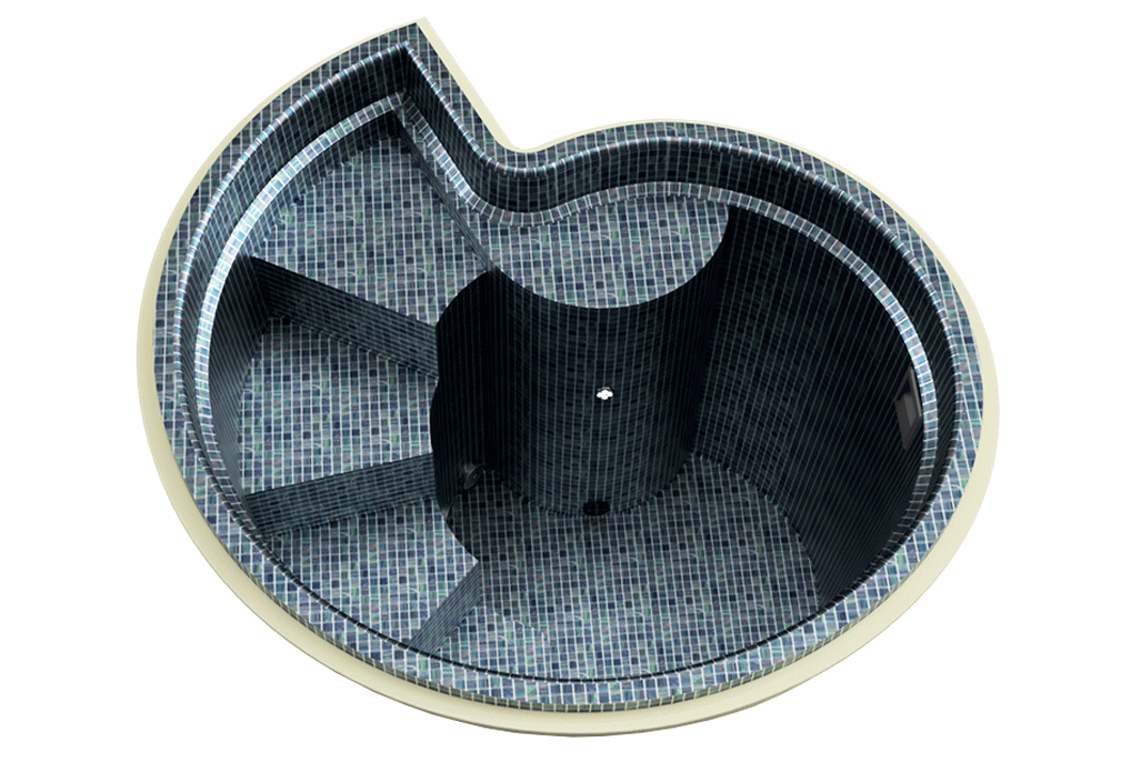 Ce petit bain carrelé en mosaique en forme d’escargot possède un look unique et un design hors du commun. Principalement utilisé comme bain froid dans les termes ce petit spa en mosaïque vous permettra d »agrémenter votre séance de sauna par un bain à basse température. On pourrait aussi imaginer l’utiliser comme bassin de récupération musculaire.