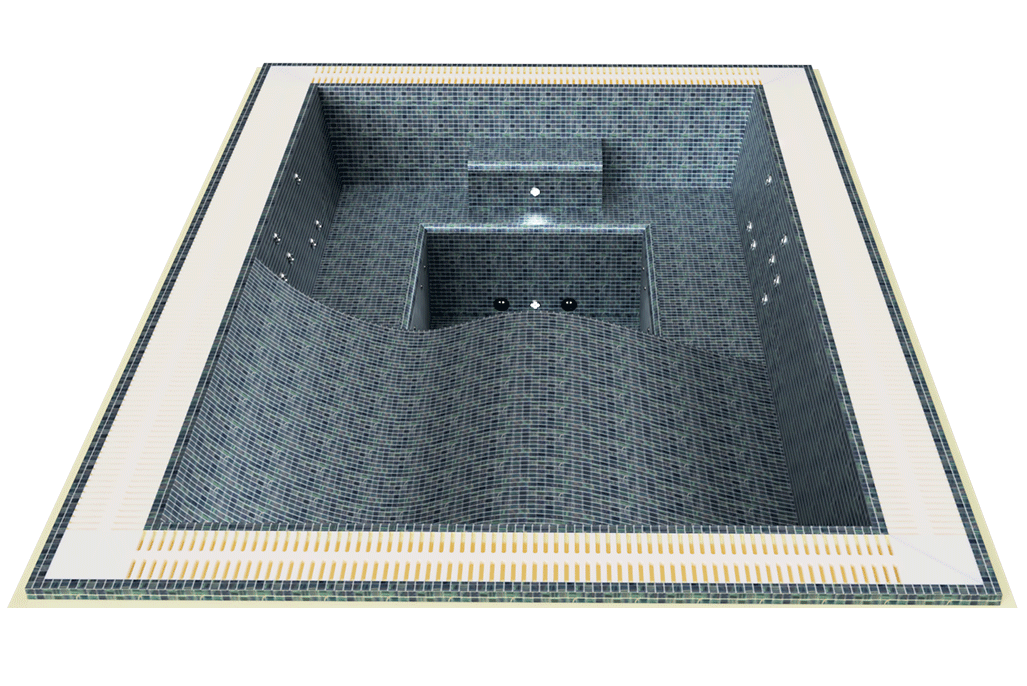 Modèle de spa rectangulaire carrelé incluant quatre couchettes en mosaïque équipée de goulotte de débordement. Mousse pulvérisée sur la coque pour une isolation renforcée. Spa monté sur un cadre en acier inoxydable. Le cadre est équipé de pieds réglables en hauteur.